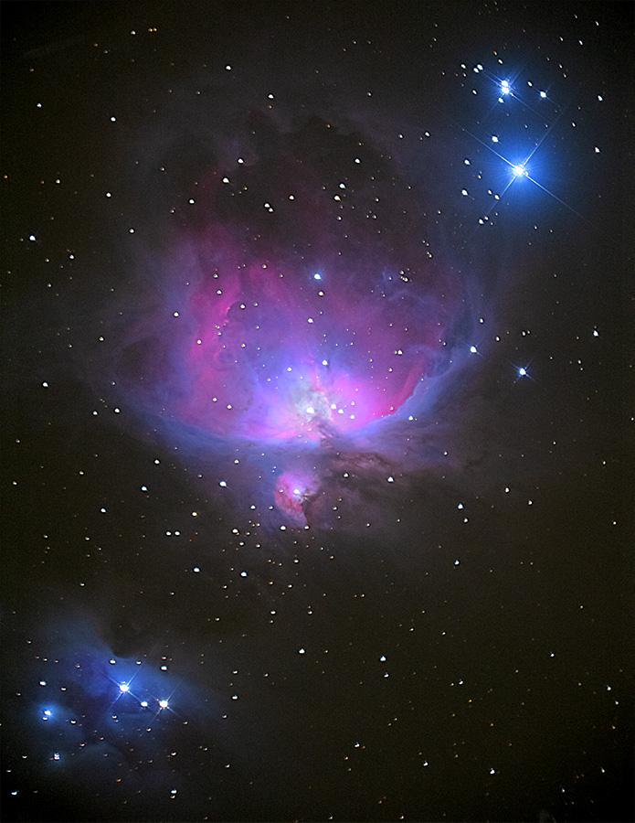 Using ISO bracketing, I was able to take advantage of the higher dynamic range at the core of the nebula near the trapezium where the light levels vary most rapidly.  I had to burn in the trapezium core and dodge the outer regions  so when I repeat this, I would probably do a series of  2 minute exposures at ISO6400 or 1 minute at ISO12800 to get more outer detail and a series of ISO100 at 1 min and a series of 30s exposures at ISO100 to get into the core.