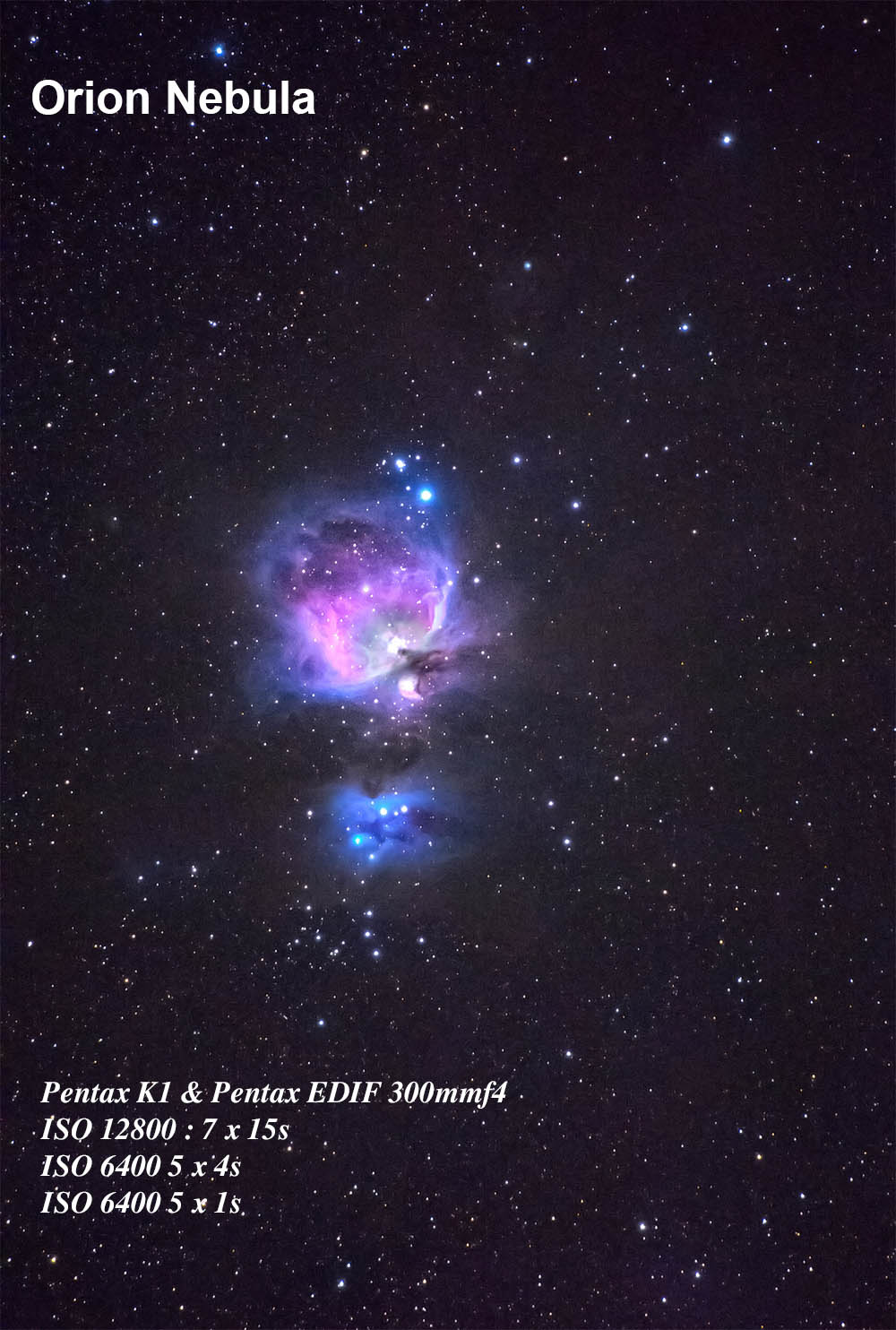 The other obvious advantage is that at lower ISO's the read noise is lower, at ISO100 on the k1 it is very small.  My next run at this technique will involve more subs at higher exposure values for the outer faint reaches of the nebula and less subs when capturing the core with the low ISO low noise characteristics of the sensor.