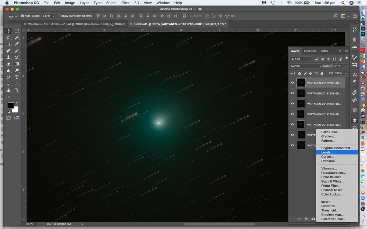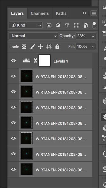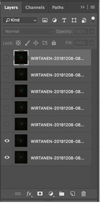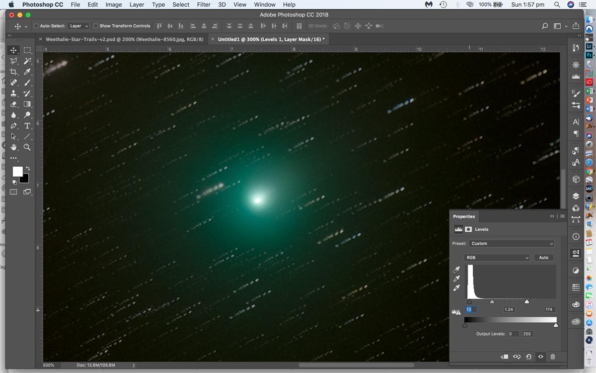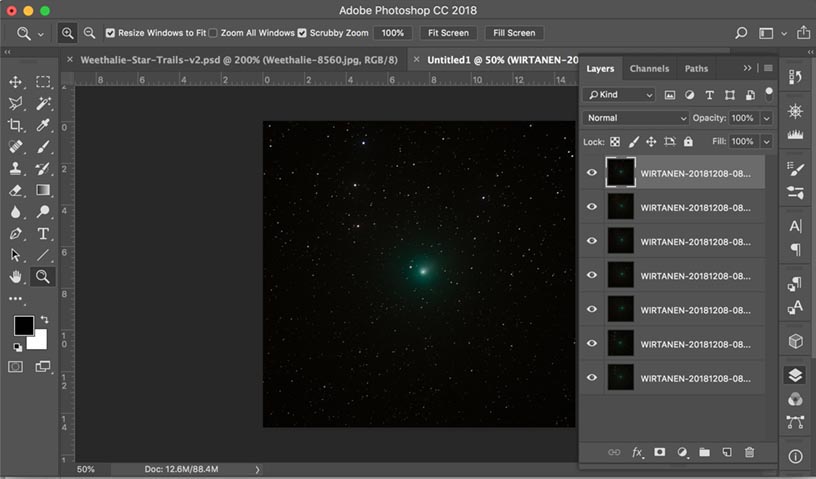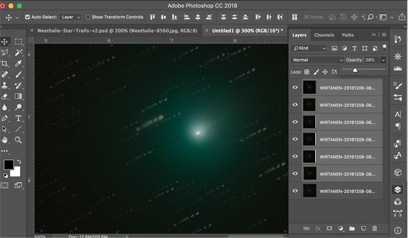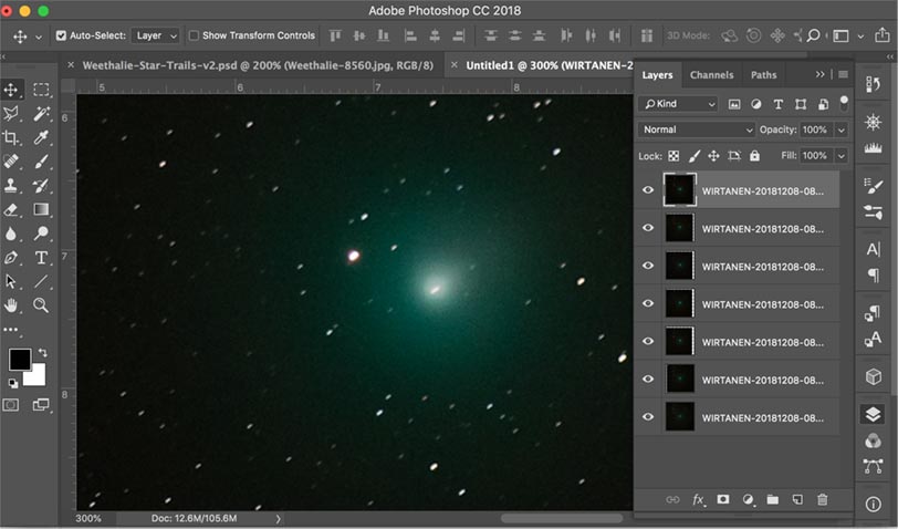 8. Initially you will see two images of each star and two ghostly comet images. Ignore the stars and using the move tool, ![]() |