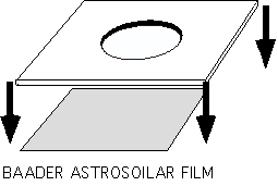 It's important to make a filter mounting that is securely attached. It must not be able to blow off or be knocked off during observing. If you want to use it for total solar eclipse observing, the filter has to be securely attached but at the same time, very easy and quick to remove about just before totality and to replaced just after totality without moving the telescope. The filter design needs to be robust so that it can travel without damage. If you restrict your observing to sunspots, partial and annular eclipses the filter does not need to be so easily removable. Ghost images and internal reflections The metallic reflective types can produce ghost images if the Sun's image bounces off the front element back onto the reflective filter then back down the optical path. One fix is to tilt the mount of the filter so it is not at exact right angles to the optical axis, the other is to use black polymer with it's low reflectivity. Note that black polymer produces an orange image colouration and is of lower optical quality than Baader film.
