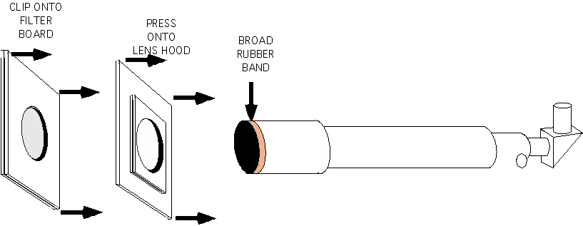 Attaching and using the filter 12. Press the flangepiece onto your telescope lenshood. If it is loose, you can put a broad rubber band around the lenshood to increase the diameter a little. This actually provides a lot more grip for the mounting flange than just pressing a tightly fitted flange directly over the lens hood. Take the protective boards off the filter piece.