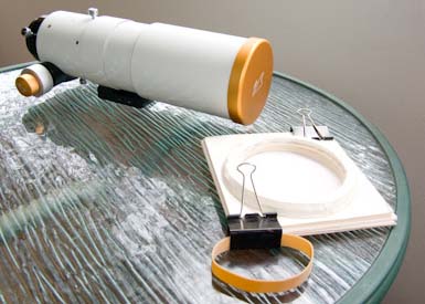 5. When finished, this flange piece will press firmly and securely onto the lens hood of the telescope. If it ends up being loose, place a wide flat rubber band around the lens hood to provide extra grip.