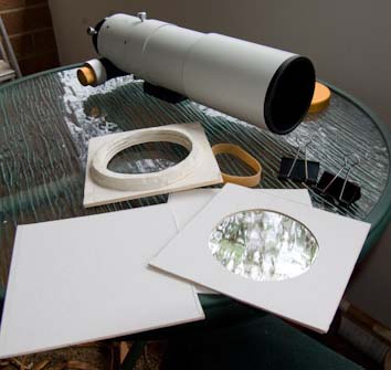 The material I use is called foamboard. Foamcore is one popular brand of this board. It's also known as poster board and by other trade names. It is used by picture framers as backing board when mounting photographs and artworks. I do a lot of picture framing of my own photographs so I always have the material on hand. However, a quick trip to a picture framers or art shop should solve the problem. If you are making filters for small refractors, the framer will probably have scraps that you can get for free.Foam board is a layer of polystyrene foam glued between two layers of thin cardboard. It is light, strong and durable. It is available in 5mm and 10mm thicknesses. I use the 5mm thickness.