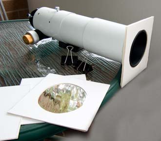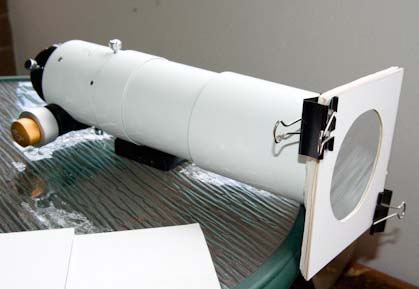 Thin film reflective material especially the Baader Astrosolar film must be mounted stress & wrinkle free. I see observers at solar eclipses with filters stretched tight over lens hoods with rubber bands. This degrades the optical image and the filters generally can't be used more than once. Baader gives a detailed explanation of how to make an inexpensive filter on their web site : - http://www.baader-planetarium.com/sofifolie/sofi_start_e.htm I use the method Baader described on that page for stress-free attachment of the filter to the mounting board but I don't like the all in one press-on cap they describe for two reasons. 1. It can't be easily and quickly removed just before totality. When observing a total solar eclipse, typically the filter is removed 15s before the diamond ring appears and replaced 15s after third contact.. So you don't have much of a margin for error. If the cap is tight, there is a chance you might move the telescope as you remove it and miss the diamond ring. 2. The cap type filter has to be transported in a large strong container to prevent damage. This takes up valuable space and weight in your luggage.