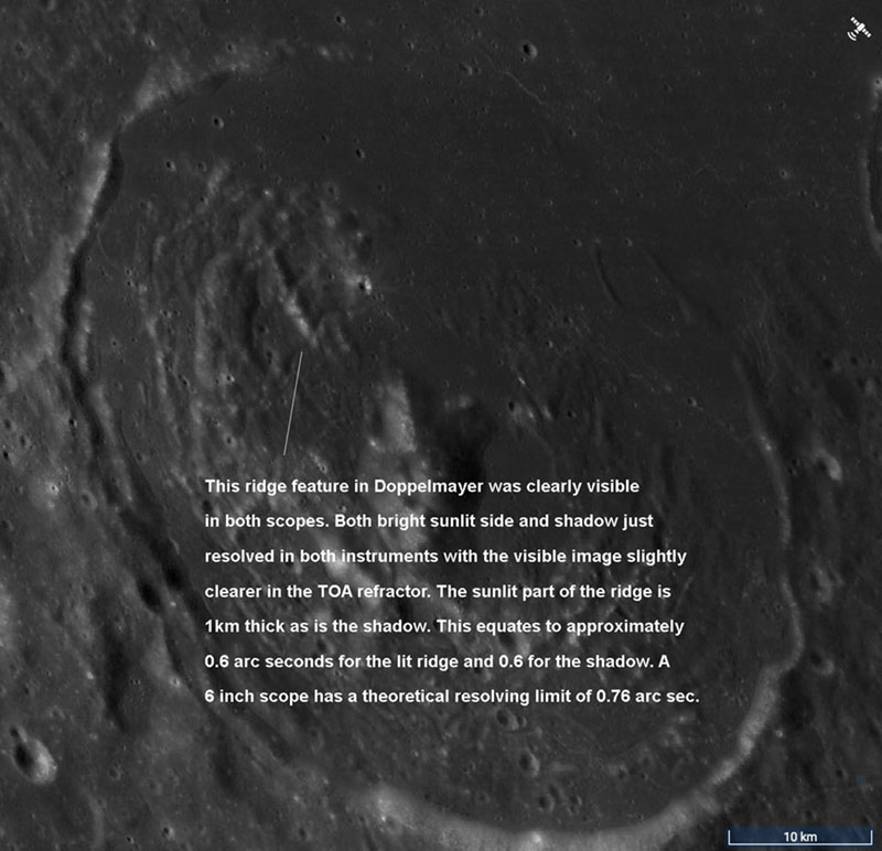 Providing the exact same eyepieces were used in both instruments, we found the views were very similar in both instruments after allowing for the slight (50mm) difference in focal length. The TOA could out resolve the reflector on all subjects but the difference in resolution was very marginal. We had to look long and hard at the finest of details to see a difference. Using eyepieces of same focal length but different brand/types/quality could elicit much greater apparent differences in views, clarity, crispness between the instruments, than the marginal difference that existed between the two instruments when identical eyepieces were used. Both instruments were resolving both the sunlit side and the shadow of the straight ridge in Dopplmayer marked in the attached photos. Each feature, the sunlit side and the shadow, measured off LROC images, was approximately 1km wide. On Saturday night, the Moon was 361000km away from Earth's geocentre, perhaps 352000 km from our topocentric location to the lunar surface suggesting that both instruments were resolving close to 0.7 to 0.6 arc sec, the TOA a little better than the Newtonian.
