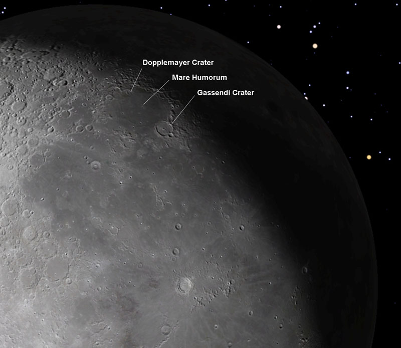 The 10-day-old waxing gibbous moon was about an hour past transit and washing out everything else. We spent the first couple of hours observing fine rills and crater details around Mare Humorum, Gassendi crater and Dopplmayer crater all of which were sunlit but just near the terminator.