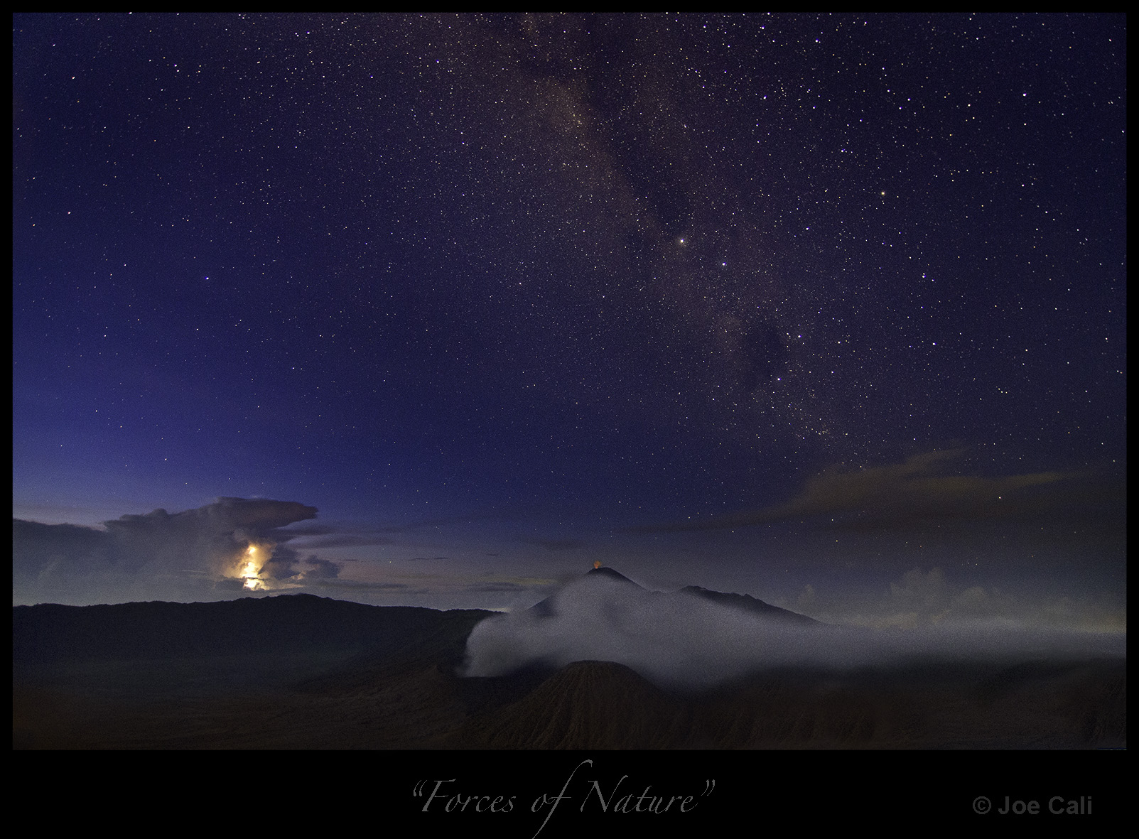 Mt Bromo billows ash, Semeru expels lava illuminated steam, lightning strike, Milky Way overhead.