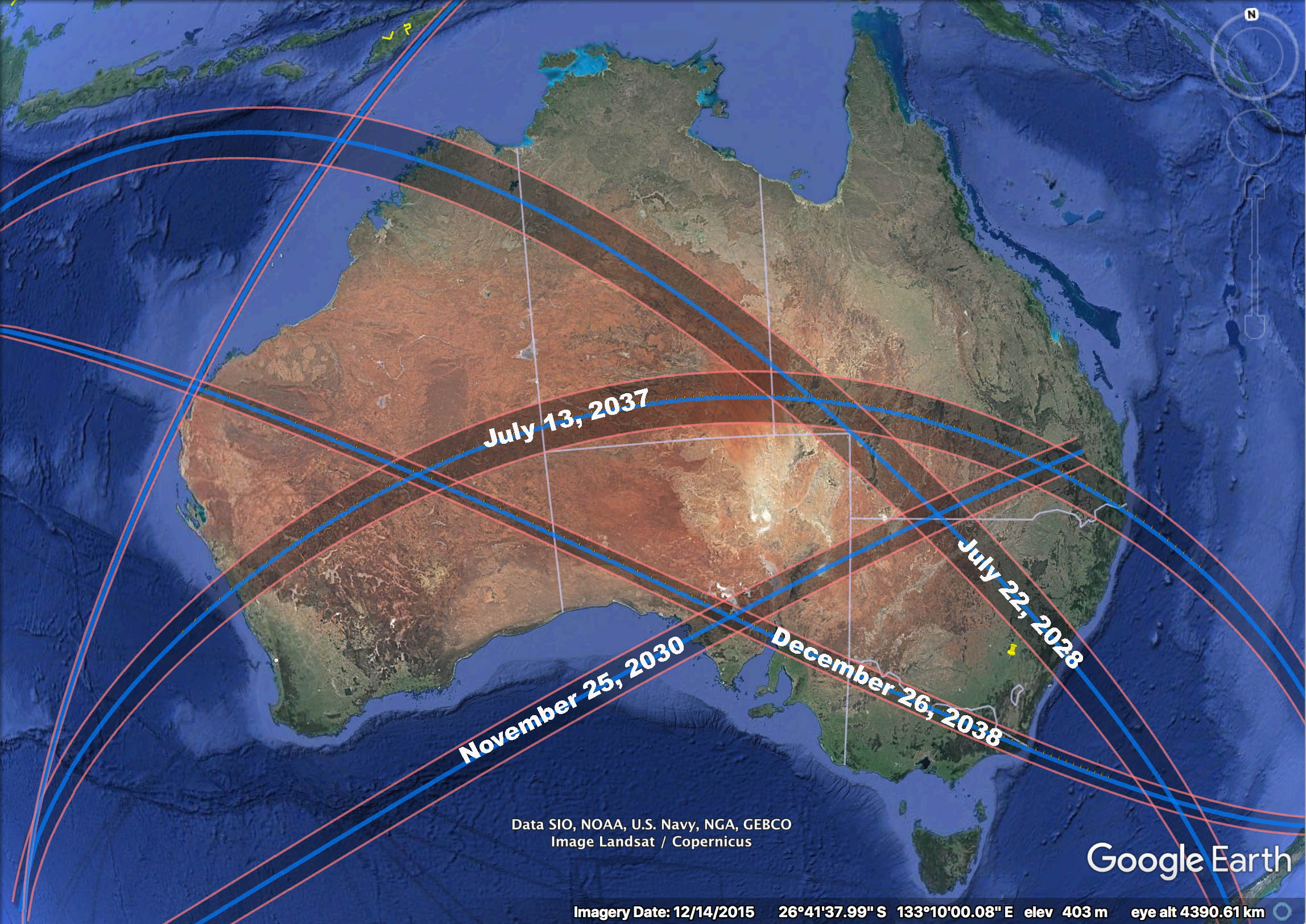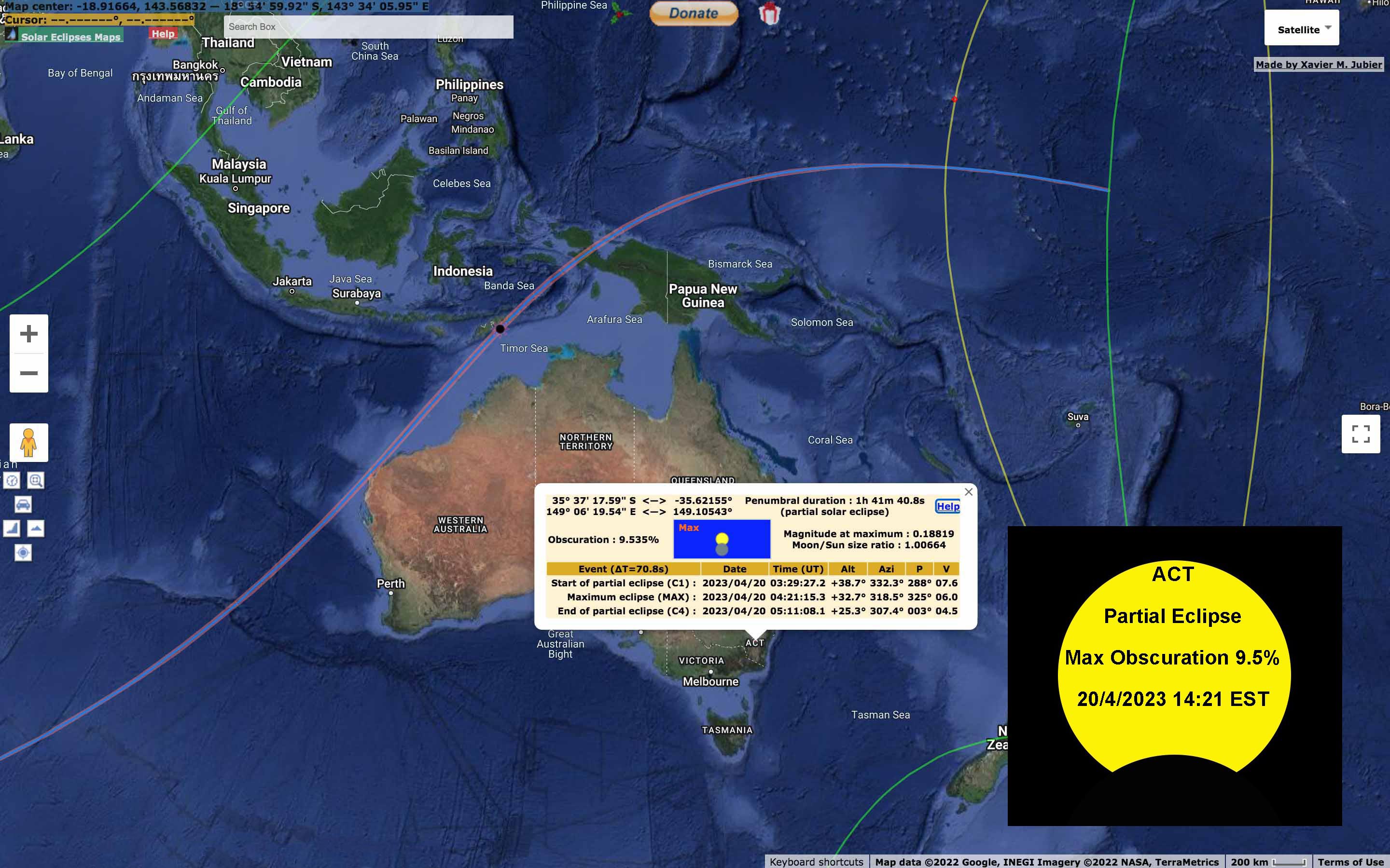 April 20th, 2023 Hybrid Solar Eclipse. Partial from Canberra, total from Exmouth W.A. A hybrid eclipse is one where the eclipse is annular in one part of the central path and total in others. Next year's eclipse is a total eclipse as seen from the Cape Arid National Park around Exmouth, WA. Cape Arid is the only region in Australia where a total eclipse can be seen. It can also be seen as total from parts of Timor-Leste and Eastern Indonesia. The rest of the Australian continent will observe a partial solar eclipse. Accommodation on the peninsula is very tight and has been difficult to secure for the past two years. It gets booked up as soon as it is released. Soft-top accommodation starts at around $550 for a minimum 6 night stay and hard-top packages range from $3000 to over $10000. I have been to 14 total eclipses in far flung corners of the world and in my experience this has been one of the most difficult eclipses I've experienced to secure accommodation. Australia will experience another 4 total eclipses over the next 15 years in 2028, 2030, 2037, 2038. All these eclipses are visible as total from the eastern states over wide areas. One passes over Sydney, Another over the southern part of greater Brisbane. If you can wait for the later eclipses, then wait. If you want to try to find accommodation for next years eclipse, contact me and I'll point you in the direction of some resources to help. From the ACT region, a partial eclipse will be observed on April 20. The eclipse will have a magnitude of 0.19 and an obscuration of 9.5%. Magnitude: the ratio of the overlap of the diameters of the Sun and Moon. About one fifth of the Sun's diameter will be covered. Obscuration: is a measure of the Sun's area covered by the Moon expressed as a percentage. 9.5% of the Sun's surface area will be covered. |