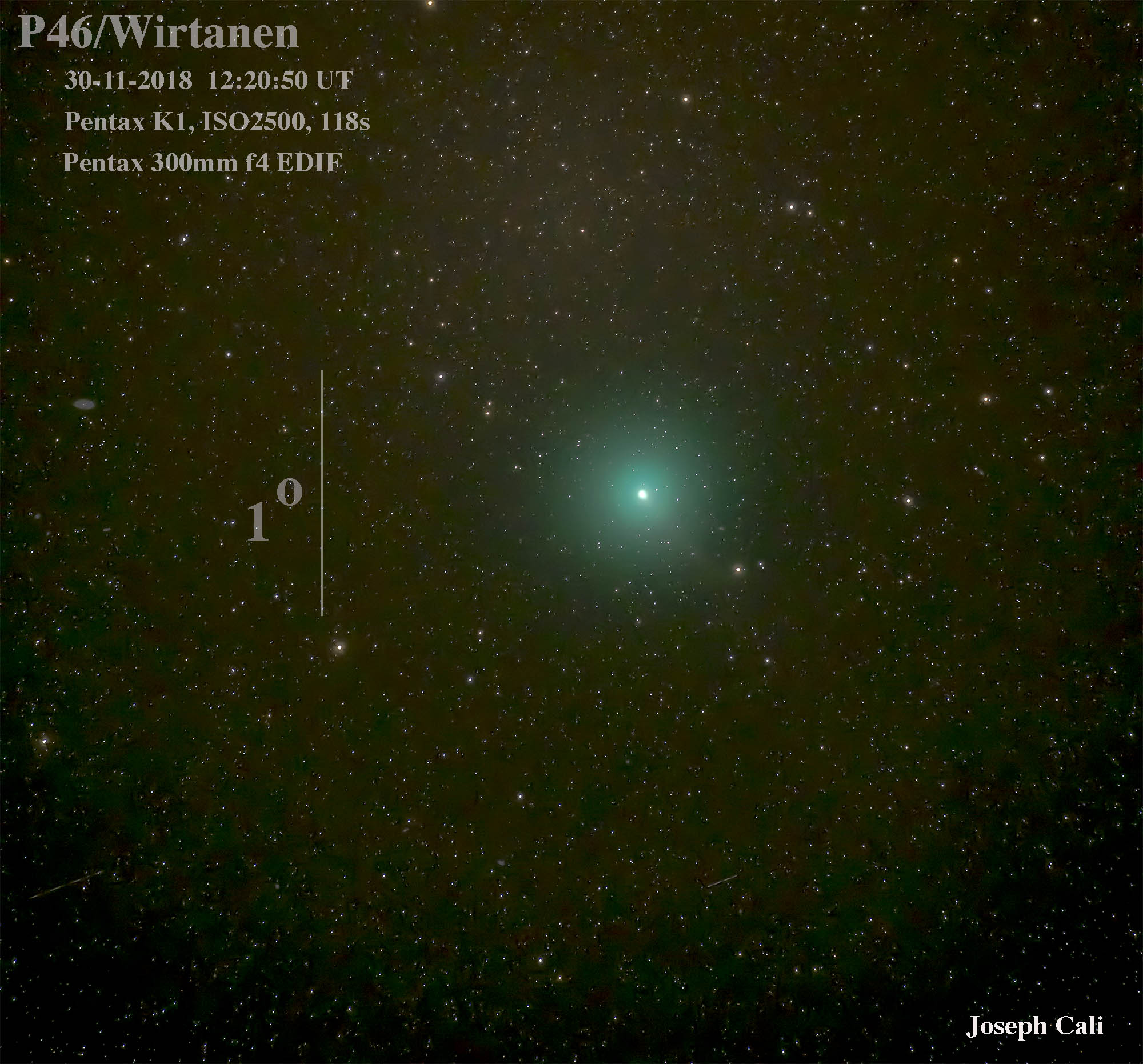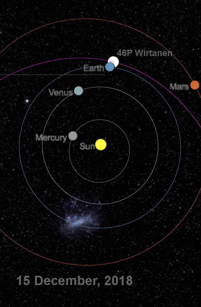 In the final months of 2018, Earth will experience what is probably the finest apparition of periodic comet (46P) Wirtanen of the 20th and 21st centuries. Carl A Wirtanen discovered 46P/Wirtanen at Lick in 1948. It is in a chaotic orbit, and its perihelion distance was much reduced due to approaches to Jupiter in 1972 and 84. 46P Wirtanen is a 1.2km diameter short period comet discovered photographically by Carl Wirtanen at Lick Observatory in 1948. Wirtanen is a Jupiter group comet that has a period of 5.43 years and aphelion of 5.1 AU. Perihelion is 1.05 AU and the orbit passes very close to the Earths orbit each perihelion. Perihelion passage grazes that part of the Earth's orbit that the Earth occupies in November-December each year. If perihelion occurs at other parts of the year, as occurs most passages, the comet is quite distant from Earth and therefore faint. This year, perigee occurs in November-December as the comet passes just 11.1 million km or 0.08AU from the Earth. Using orbital calculators, this appears to be the closest approach since discovery and for the rest of this century. Use 3D viewers to visualise the orbit and the close passage to Earth?