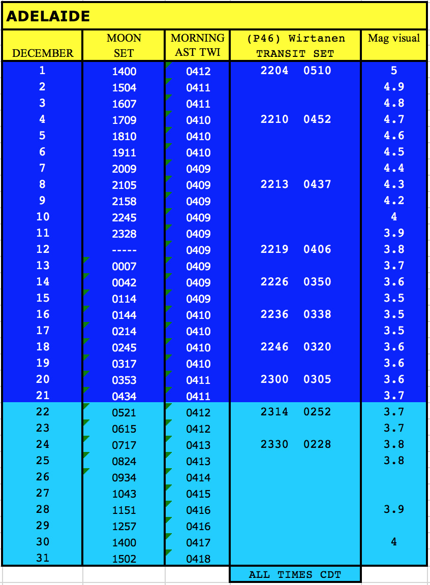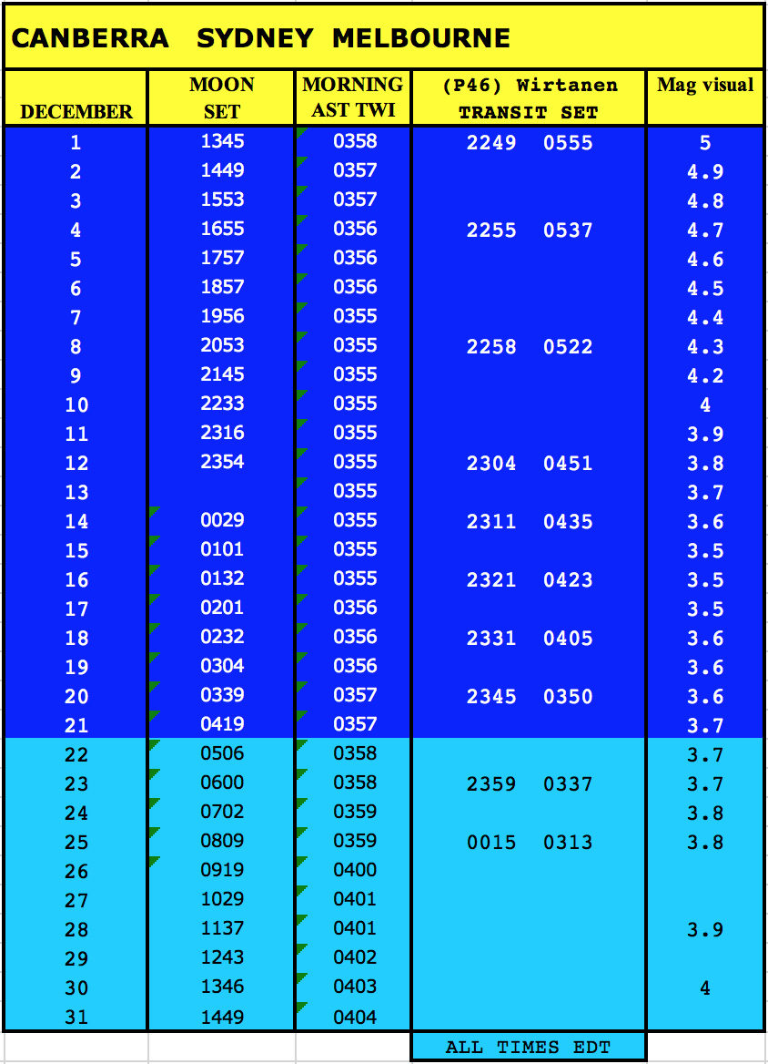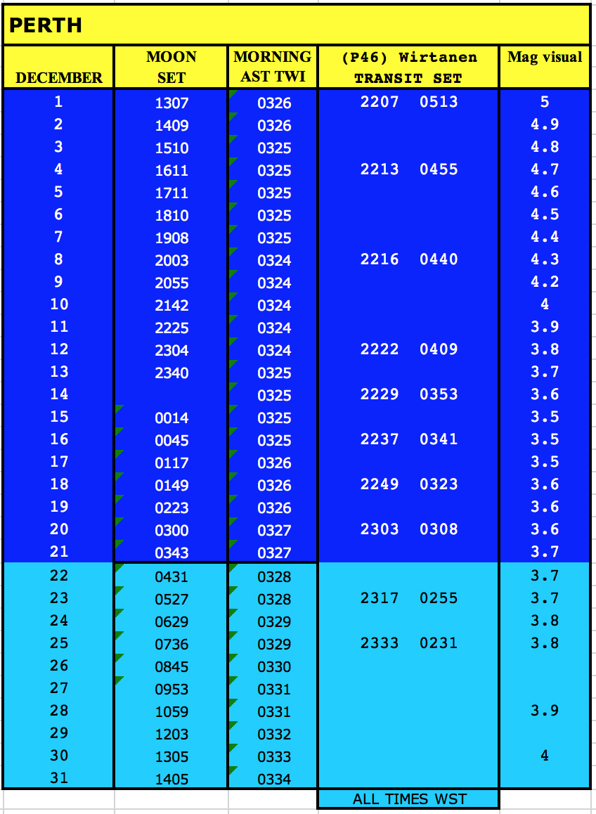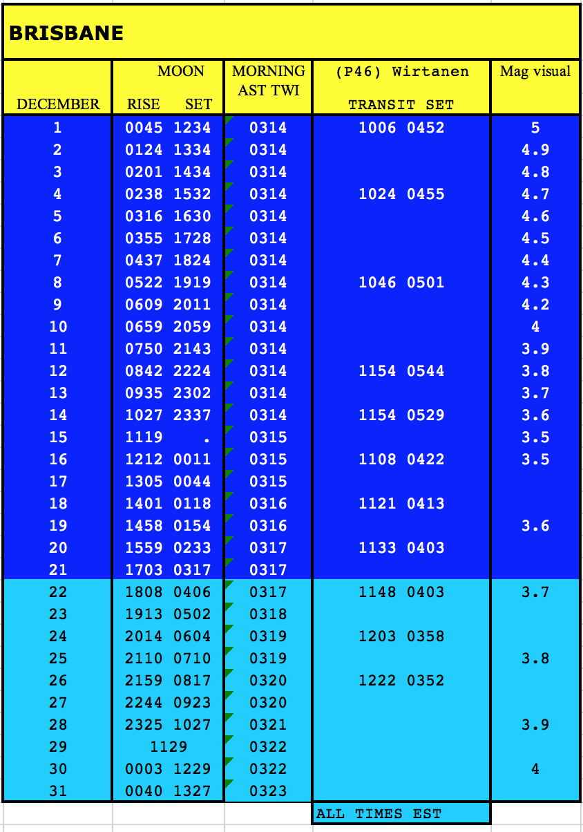 2018 Apparition Visibility of this apparition is pretty equally favourable between north and south hemispheres. During October and November, the southern hemisphere gets prime view. At perigee in mid December, the comet is visible to both hemispheres. Mid-southern latitudes will lose sight of the comet before Christmas eve. North Queensland members may see it a little longer before it moves to far north declinations. Though the north hemisphere gets to see it post perigee, the full and waning Moon will interfere with observations for our northern friends from December 21 onwards through full Moon and until the Moon's crescent is small enough in January not to cause problems. Telescope owners may find it's worth observing and tracking the brightening of the comet from late October onwards when it will be an easy telescopic, and faint binocular comet. In mid-December, expect to possibly see a 3.5 magnitude fuzzy ball, 1-2 degrees diameter, not much of an ion tail (it's pointing away from us) passing between the Hyades and the Pleiades before disappearing over the north horizon. A waxing gibbous Moon will partly interfere with our mid-December observations. This comet's perigee passes outside the Earth's orbit effectively at opposition, which results in the comet transiting at midnight. Maximum brightness occurs around 1st quarter Moon (Dec 15). There are dark sky observing windows in the pre-dawn hours between midnight moonset and twilight reducing to nothing by December 21st. Even at last quarter Moon on December 15th, the Moon will set with the comet still high in the sky up to and around last quarter. Table 1 shows the visibility for SE Qld of the comet with respect to the Moon. Light blue indicates an interfering bright Moon, dark blue a dark sky observing window after moonset and before twilight. I have also included a column indicating the moonless hours of each night when the comet is up. Tail The comet pretty much remains at midnight opposition all through perigee/perihelion. Consequently, the tail will be pointing away from us all through this period. The comet's appearance will be that of a large symmetrical fuzzy ball as I have illustrated in the December 17 illustration above. Magnitude predictions Magnitude estimates from the NASA HORIZONS web interface indicate a maximum magnitude of about 9 in December. The comet is already this bright in October. The magnitude estimates presented here come from Seiichi Yoshida’s Bright Comet Web page. The two sites use quite different methods to determine brightness. HORIZONS uses a standard IAU formula based upon averages taken across many different comets including those that disappoint. This comet's brightness comes from proximity not anticipated outbursts. Yoshida has developed a brightness curve based on past observations of this comet. I think this method is more reliable. Observational brightness estimates in mid-October placed the comet at mag 9-9.5 and already following Yoshida's calculated brightness curve not the HORIZONS estimates. |