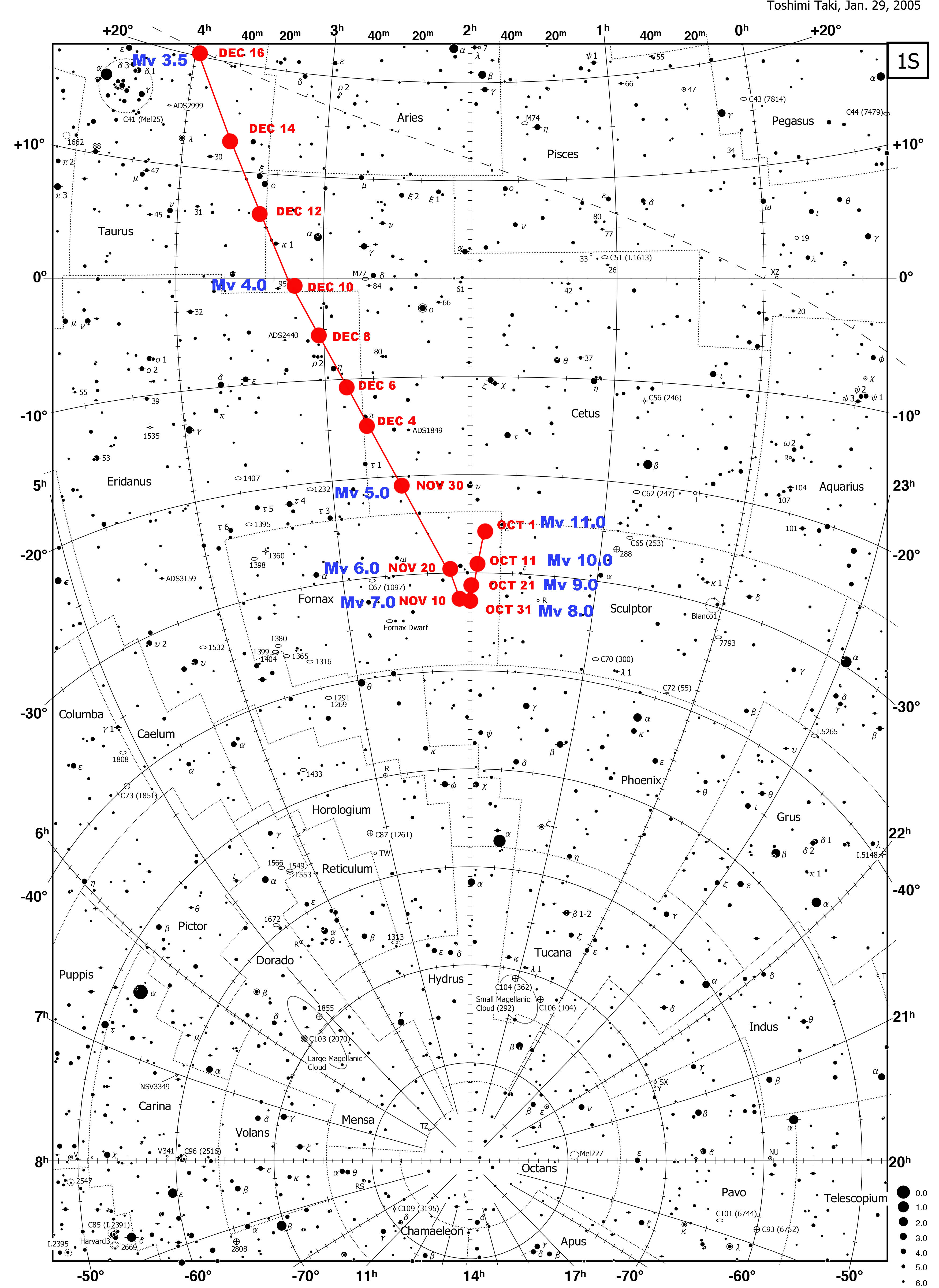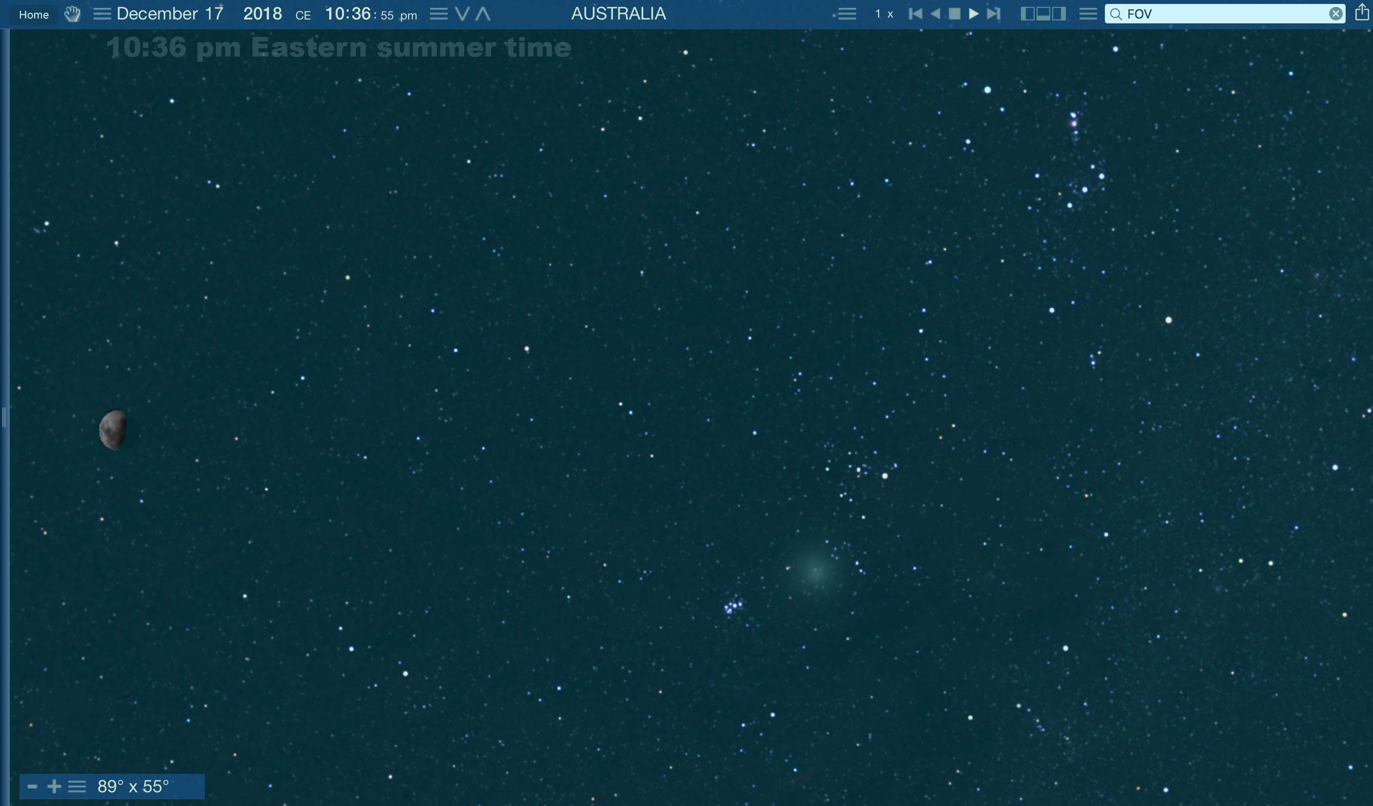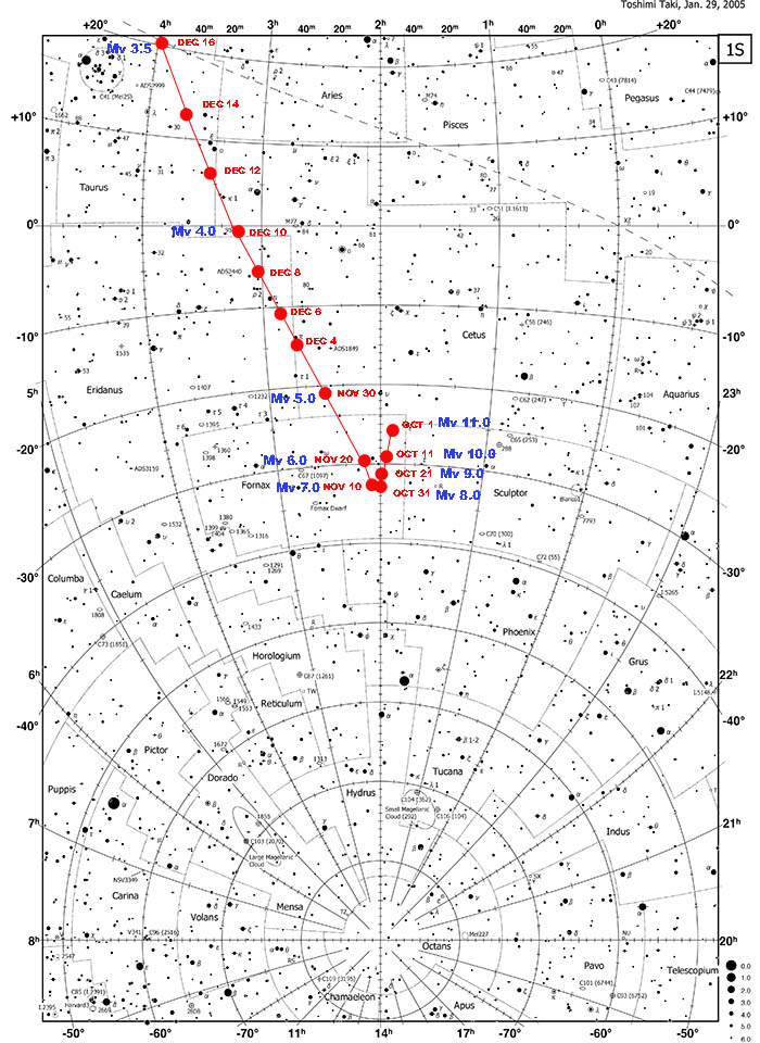 2018 Apparition Visibility of this apparition is pretty equally favourable between north and south hemispheres. During October and November, the southern hemisphere gets prime view. At perigee in mid December, the comet is visible to both hemispheres. Mid-southern latitudes will lose sight of the comet before Christmas eve. North Queensland members may see it a little longer before it moves to far north declinations. Though the north hemisphere gets to see it post perigee, the full and waning Moon will interfere with observations for our northern friends from December 21 onwards through full Moon and until the Moon's crescent is small enough in January not to cause problems. Telescope owners may find it's worth observing and tracking the brightening of the comet from late October onwards when it will be an easy telescopic, and faint binocular comet. In mid-December, expect to possibly see a 3.5 magnitude fuzzy ball, 1-2 degrees diameter, not much of an ion tail (it's pointing away from us) passing between the Hyades and the Pleiades before disappearing over the north horizon. A waxing gibbous Moon will partly interfere with our mid-December observations. This comet's perigee passes outside the Earth's orbit effectively at opposition, which results in the comet transiting at midnight. Maximum brightness occurs around 1st quarter Moon (Dec 15). There are dark sky observing windows in the pre-dawn hours between midnight moonset and twilight reducing to nothing by December 21st. Even at last quarter Moon on December 15th, the Moon will set with the comet still high in the sky up to and around last quarter. Table 1 shows the visibility for SE Qld of the comet with respect to the Moon. Light blue indicates an interfering bright Moon, dark blue a dark sky observing window after moonset and before twilight. I have also included a column indicating the moonless hours of each night when the comet is up. Tail The comet pretty much remains at midnight opposition all through perigee/perihelion. Consequently, the tail will be pointing away from us all through this period. The comet's appearance will be that of a large symmetrical fuzzy ball as I have illustrated in the December 17 illustration above. Magnitude predictions Magnitude estimates from the NASA HORIZONS web interface indicate a maximum magnitude of about 9 in December. The comet is already this bright in October. The magnitude estimates presented here come from Seiichi Yoshida’s Bright Comet Web page. The two sites use quite different methods to determine brightness. HORIZONS uses a standard IAU formula based upon averages taken across many different comets including those that disappoint. This comet's brightness comes from proximity not anticipated outbursts. Yoshida has developed a brightness curve based on past observations of this comet. I think this method is more reliable. Observational brightness estimates in mid-October placed the comet at mag 9-9.5 and already following Yoshida's calculated brightness curve not the HORIZONS estimates. |