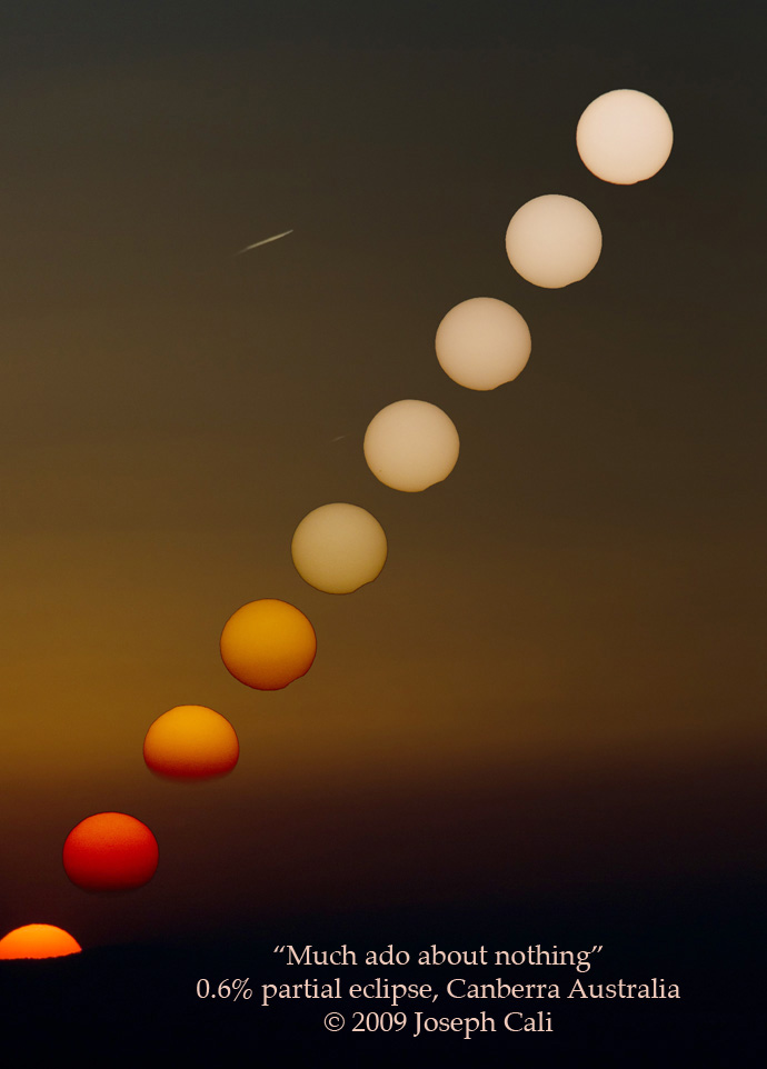 On January 26th 2009, an annular solar eclipse was visible from the Cocos Islands and Indonesia. My home in Canberra Australia was in the south east corner of the eclipse footprint. Basically we would see almost the smallest percentage eclipse possible, just 0.6% as the Sun set. This gave me the idea for this quirky photo. which I've called "Much ado about nothing." Typical at this time of year is the thick bushfire smoke. This eclipse was only 10 days before "Black Saturday" when more than 200 people died in Victorian fires a few hundred km south.