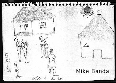 I noted four prominent beads on the reappearing side centres around PA270. As the diamond ring appeared marking the end of totality, I took my eye from the eyepiece, called for the horn to be honked signalling the end of totality. I thought I noticed movement in the prominences during totality but eventually passed this off as an optical illusion of the movement of the lunar disk. Nonetheless it is a very dynamic vision. During totality I observed Jupiter, Rigel, Betelguese, Sirius and Canopus naked eye. The sky during totality was a stunning crimson red all around the horizon and yellow brown and orange at progressively higher altitudes. This was a side effect of smoke. My partial eclipse shots are taken using a KODAK ND4 filter. The images are yellow . The solar image through this filter is usually white. The 3rd contact diamond ring seemed to last a very long time, an observation that I heard made by many observers over a wide geographical area. Totality was a very special event for my fellow observers and I. We were overcome by the village women, ululating loudly at the site of totality. Before totality, one man said he couldn't understand why I had travelled all that way to see an eclipse. I asked him to come and speak to me after he had seen the eclipse. After totality he came up to me, teary eyed and said,"Now I understand." For the more adventurous readers of this report, I thoroughly recommend this type of philanthropic project to other eclipse observers at future eclipses in third world countries. It takes so little effort for such great rewards. All of us have been on a high for the past months remembering the day. After the eclipse we returned to ZASTI for three days of eclipse post-mortems and discussions with other observers staying there. I returned to Kapini as a guest science teacher for three more days. I reluctantly left Kapini and returned to Lusaka. I stored my telescope, packed a backpack and went travelling for the next four weeks to South Luangwa NP, Jungle Junction, Victoria Falls and Kruger NP. Now I have 1000 slides to sort. Check the travel pages and from the Zambia intro page for other image galleries and photoessays.