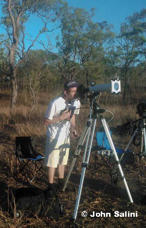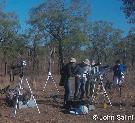 Great Oz Eclipse of November 2012 by Joe Cali Site 3B Road Camp A handful of tour members were up the road at site 3B. These included John Salini, Paul Muir Greg, Leeanne & Liz Bond Tony Dutton, Wendy Hodge, Joanne Dutton Gabi & Joerg Ackermann Melissa Hulbert and the Sydney Observatory Group (41 pax) were also there. John Salini Our convoy of observers went all the way to site 3B (tks Joe for the research in to that site) where the Sun came up alarmingly late, and well in to the partial phases, but compensated with a fabulous display. My biggest pleasure is the GoPro time lapse video which clearly shows the darkening (never really was totally dark) and then the retreat of the Lunar Umbra and advancement of Sunlight....quite compelling! Note : The Sun was supposed to come up alarmingly late - Joe |