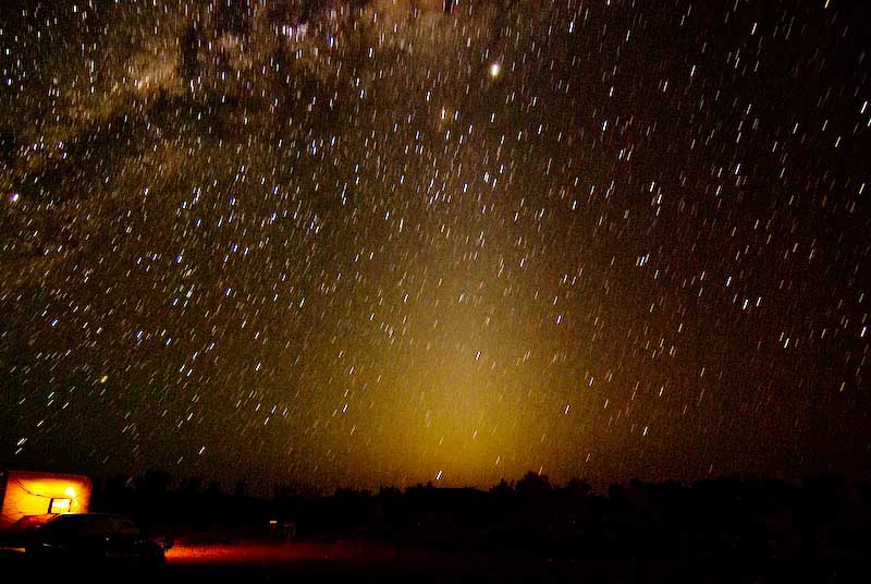 I spent September and October of 2007 travelling around Central Australia. One thing that grabbed my attention each night was the intensity of the Zodiacal Light. The Zodiacal light is light that bounces off interplanetary dust lying in the plane of the solar system. A couple of hours after sunset the angle is just right that reflection off the dust is seen quite clearly on Earth as a glow in the sky It is about as bright as the lightglow from a large country town. Though I've seen it many times in the eastern states, there is always a little doubt in my mind because there is always a distant town in that direction. This photo was taken from the campground at Rainbow Valley National Park, south of Alice Springs. The nearest town in that direction is about 1500km away. Pentax K10D, 12-24mmf4ED@f4, 3 mins 20s, ISO 100 on tripod (no tracking) Joe Cali