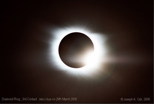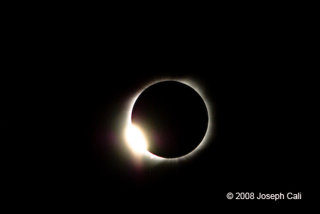 During the minute or so before the eclipse the lunar shadow covers the sky. The ambient light will dim dramatically reducing by a factor of about a thousand. If you have a really accurate time source, you can remove your eclipse glasses about ten seconds before the start of the total eclipse. The Moon's shadow by now will have moved right across to cover the whole of the sky. When the front edge of the shadow reaches the Sun, the diamond ring will form and the total eclipse begins. The diamond ring is a bright ring of light surrounding the dark lunar disk with one dazzling bright white point of light.