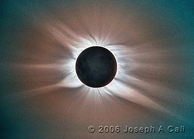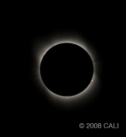 ![]() The diamond ring light is the last little bit of the Sun's surface visible through the deepest valley that points at Earth on the the edge of the Moon. Even when this disappears, it won't. go completely dark, more like a very deep twilight. Your eyes will quickly adjust to the new low light level. As your eyes adjust, the Sun's corona will become visible. The corona is composed of very hot electrically charged gas - a plasma. The coronal gas has a temperature of about a million degrees and it stretches millions of kilometres out into space. The charged particles are distributed along and reveal the Sun's magnetic field lines similar to the way your science teacher at school might have used iron filings to reveal the field of a magnet. The corona will appear to grow. This is just an illusion caused by two factors. As the umbra replaces the penumbra in the sky around the Sun, the background sky darkens rapidly allowing the faint corona to be mre visible. The outer corona is fainter than the inner corona. As your eyes quickly adapt to the dark mainly due to dilation of the pupils, they become more sensitive so you are able to see fainter parts of the outer corona so it seems to grow. Nonetheless, the effect is mesmerizing and if you are observing the eclipse in the presence of a large crowd, you usually hear one loud synchonized gasp from the crowd. ![]() As totality ends, a diamond ring dazzles you as it seems to explode from the opposite side of the Moon to the first diamond ring. This one seems much brighter than the first because your eyes are adapted to the dark. The appearance of the second diamond ring is your signal to put your eye protection back to work. Put on your eclipse shades or use your projector and don't look directly at the Sun for the remainder of the eclipse. The Moon spends another hour in partial eclipse as it gradually uncovers the Sun. This time the disc will continue its motion to the east and slide off downwards towards the horizon. The event is all over by 7:40 am.