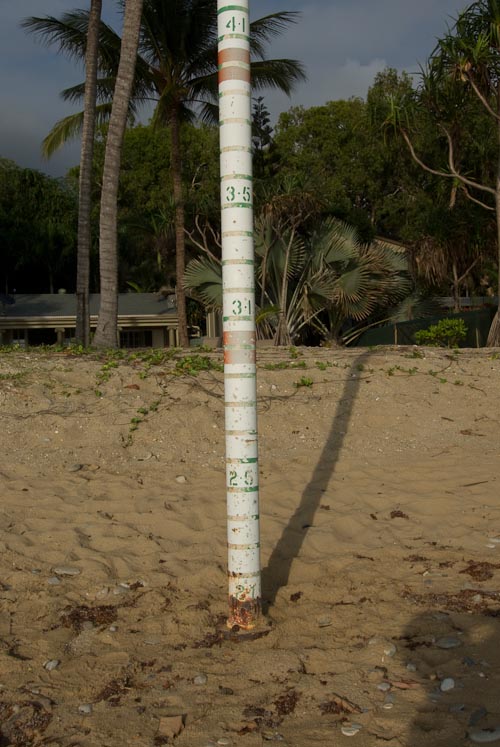 Location In the photo above I tried to take the photo keeping the camera level with the ground in the beach house yard. I was probably a touch low. The back yard is more like 3.1m. In the photo below, I've constructed contours and then using tide data, annotated the photo with times when the tide will reach it.