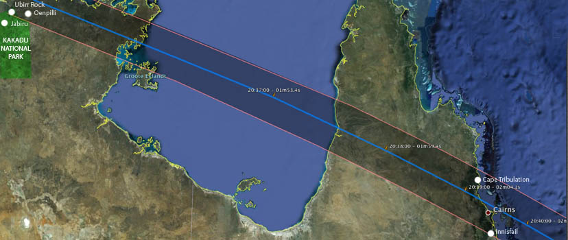 The eclipse path The 2012 total eclipse can be seen along the coast from a 140 km wide path. The path crosses the coast at an angle so that the 140km wide path covers a 200km swathe of coastline between Innisfail in the south to Cedar Bay National Park about half way between Cape Tribulation and Cooktown. Outside this area, a partial eclipse only will be visible. Just outside the total path, for example south Innisfail, a 99.9% partial eclipse is visible. Be in no doubt, a 99.9% partial eclipse is not almost the same as the spectacle of a total eclipse. If you live near the edge of the path, get in the car and drive into the path of totality. Anywhere between Gordonvale and Port Douglas on or near the coast are the best places to see the eclipse. The duration is longest in this area. The total part of the eclipse lasts for two spectacular minutes anywhere between Cairns and Port Douglas. To the north and south, duration gets progressively shorter and shorter until, near the southern and northern limits, it only lasts for a few seconds. For folks living in or near Innisfail, watch from at least 20km north of Innisfail say Babinda or Bramston Beach to get a decent duration of about 1m 20s.
