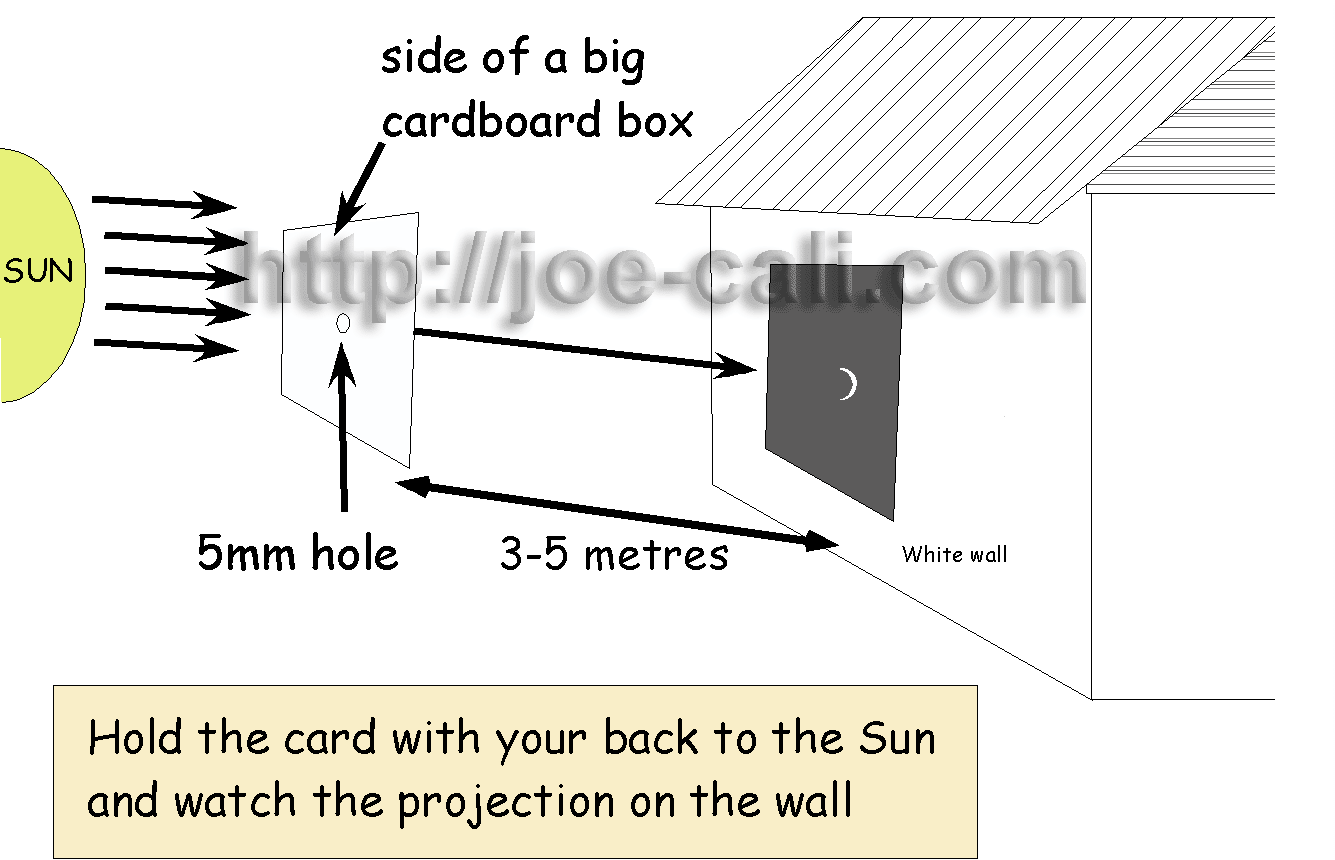 Filters ![]() The oldest safe method is the projection method. Cut the side out of a large cardboard box. Punch a 5mm hole in the side. ![]() The Sun will be rising as the eclipse begins. Stand about 3-5m away from the east wall of a white walled building. With your back to the Sun hold the card up so that its shadow falls on the wall. In the middle you will see a small image of the partially eclipsed Sun.