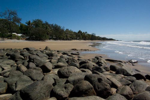| North car park | Looking south from north end of beach | Trees and powerlines spoil the view where the centreline crosses the Captain Cook Highway |